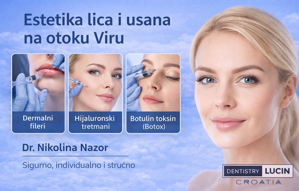 Estetika lica i usana u stomatološkoj ordinaciji Lucin na otoku Viru obuhvaća dermalne filere, hijaluronske tretmane i botulin toksin uz individualan i stručan pristup. Saznajte kako postići prirodan, svjež i uravnotežen izgled lica uz sigurne nekirurške estetske zahvate.