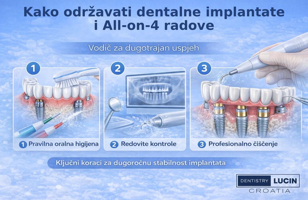Saznajte kako pravilnom oralnom higijenom, redovitim kontrolama i profesionalnim čišćenjem osigurati dugotrajan uspjeh dentalnih implantata i All-on-4 terapije. Praktični savjeti iz svakodnevne kliničke prakse ordinacije Lucin na otoku Viru.